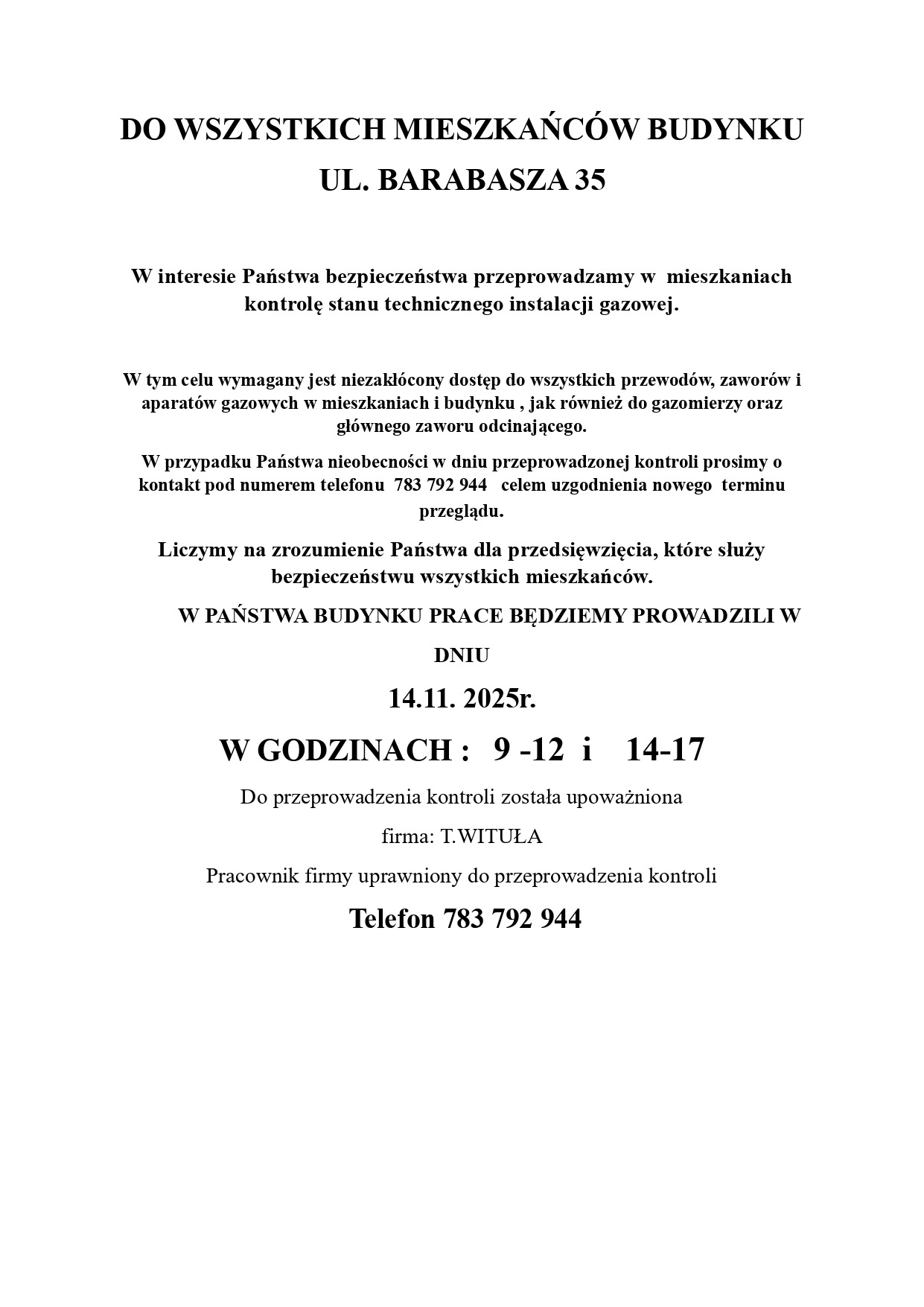 Barabasza 35 – przegląd instalacji gazowej – 14.11.2025r