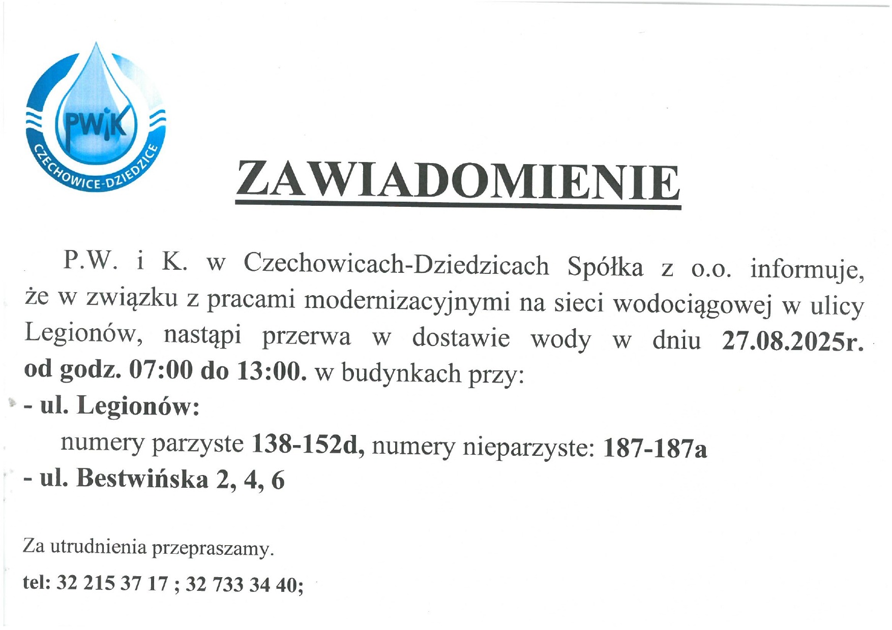 Poniżej ogłoszenie PWIK dotyczące planowanej przerwy w dostawie wody: