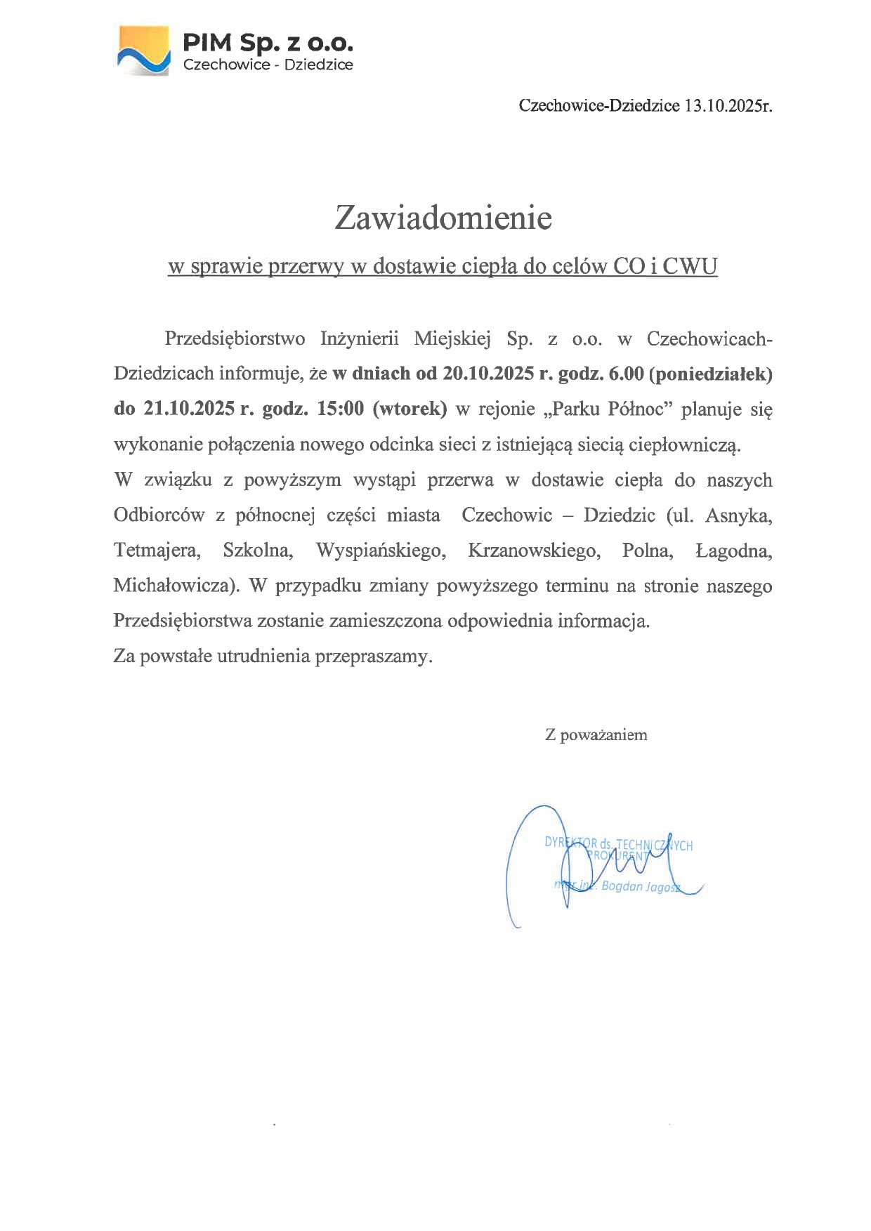Przerwa PIM w dostawie ciepłej wody i c.o. – 20-21.10.2025r. W załączeniu ogłoszenie o przerwie Przedsiębiorstwa Inżynierii Miejskiej w dostawie ciepła na osiedlu Północ.