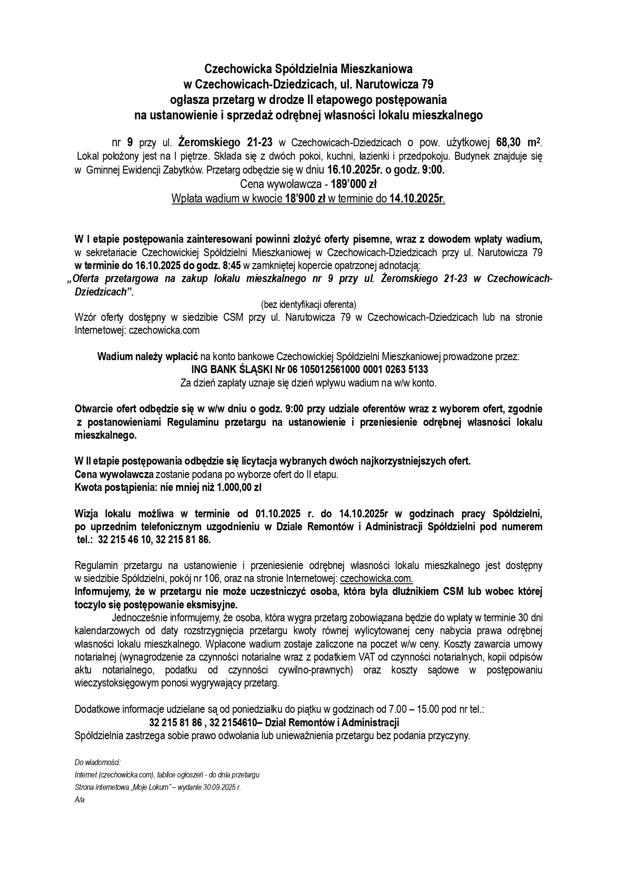 Przetarg na lokal mieszkalny – Żeromskiego 21-23 m.9 – 16.10.2025r. godz. 9:00