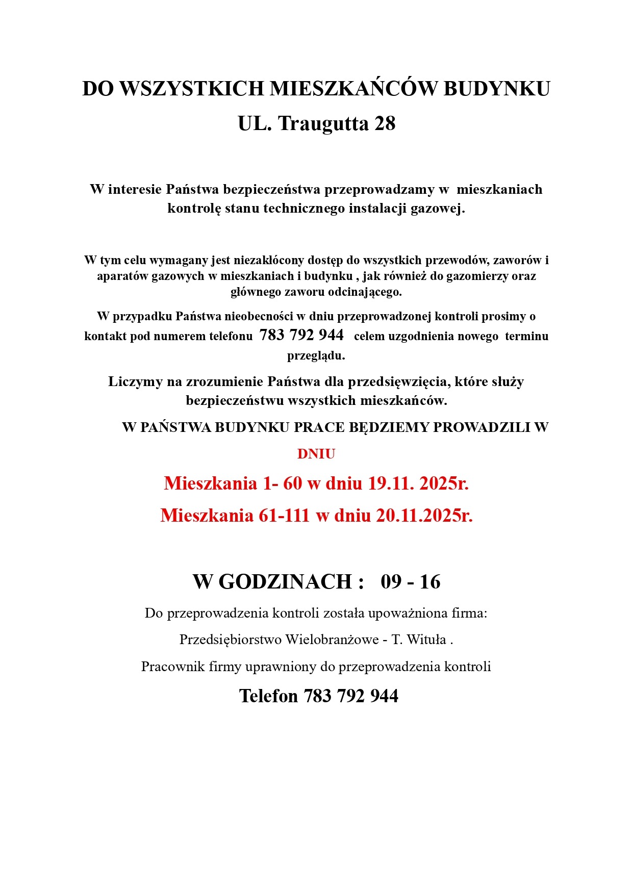 Traugutta 28 – przegląd instalacji gazowej – 19-20.11.2025r.